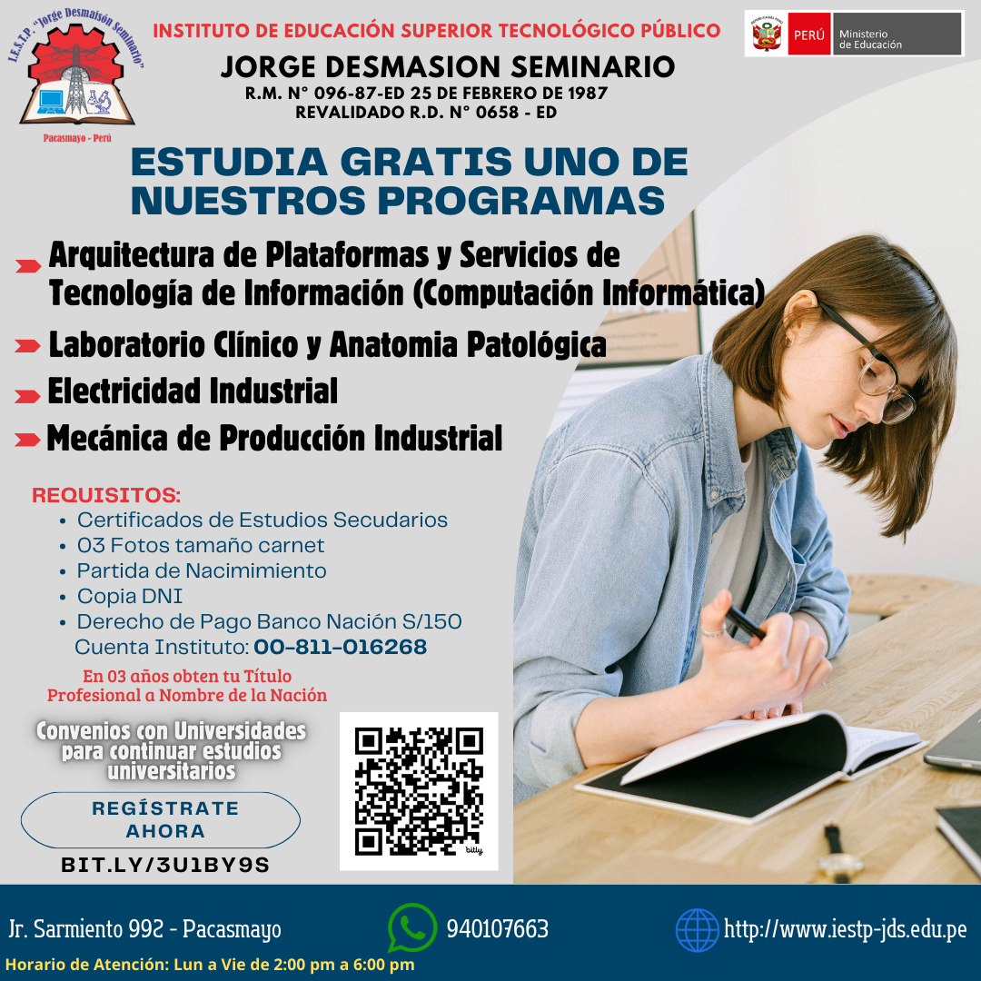 El pago se hará directamente en la cuenta corriente del IESTP “Jorge Desmaison Seminario” en el Banco de la Nación en la cta. Cte. Nº 00-811-016268.