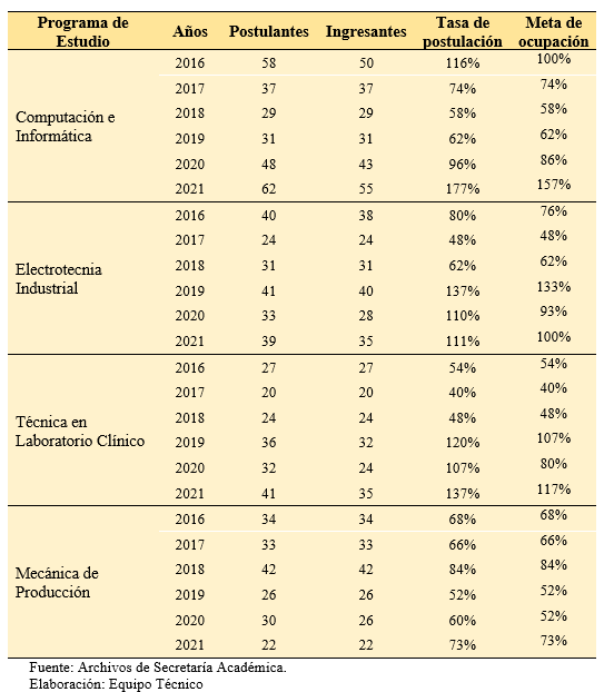 Postulantes, ingresantes, tasa de postulación y meta de ocupación, según programas de estudios del IESTP “Jorge Desmaisón Seminario” de Pacasmayo. Periodo 2016 – 2021